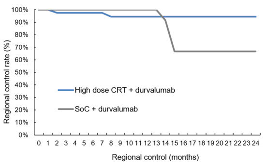 We were able to demonstrate that sequential high-dose chemoradiation followed by durvalumab shows similar pulmonary toxicity rates as SoC (Table 3, Figure 1) and that this regimen yields better intrathoracic disease control (Figure 2 and Figure 3). The results of this study, which is the first to compare high-dose irradiation with SoC, allow us to assume that radiation dose escalation can be safely combined with durvalumab maintenance therapy.
