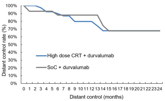Distant control. The comparison revealed no difference in distant control between high-dose chemoradiation and SoC treatment (log-rank test, p-value = 0.763): CRT = chemoradiotherapy, SoC = standard of care.