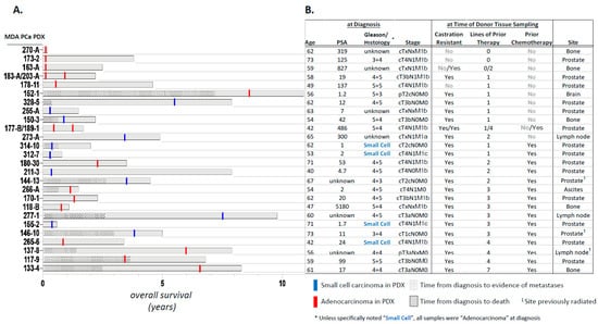 The 28 patient-derived xenograft (PDX) models of human prostate cancer used in this study. (A). Clinical course of the tumor tissue donors represented as a function of overall survival, along with morphology at the time of donor tissue retrieval (adenocarcinoma vs. small cell carcinoma). Also shown is time from diagnosis to evidence of metastasis. (B). Shown are age at diagnosis, PSA, Gleason score and tumor stage (as available), castration resistance, information on prior therapy and site of donor tissue for the 28 PDXs.