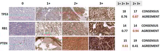 Consensus and agreement calling in immunohistochemistry (IHC)-based determination of tumor suppressor loss, in 28 PDX models of human prostate cancer. Figure 2 shows representative photomicrographs of PDXs stained for TP53, RB1 and PTEN demonstrating different staining intensity levels, and the proportion of samples a reviewer votes with the consensus vote for different markers (TP53, RB1 and PTEN) and definitions of positive (1+2+3+ or 2+3+ IHC % labeling indices). The consensus vote is the majority determination of abnormal for that sample across the 9 reviews (3 labs × 3 reviewers). Shown are the number of abnormal samples based on the consensus of the reviews and the Fleiss κ, which measures the level of agreement among the reviewers. Fleiss κ values of 0.41–0.60 indicate moderate agreement, 0.61–0.80 substantial agreement, and 0.81–1.00 almost perfect agreement. Also shown are representative IHC images reflecting 0, 1+, 2+ and 3+ staining intensities for TP53, RB1 and PTEN (magnification: 20×, scale bar = 200 µm).