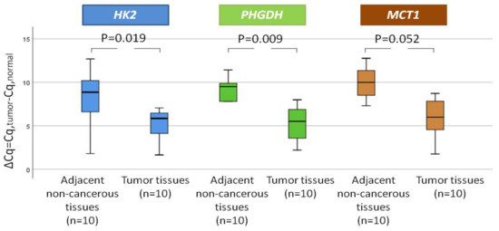 The expression levels of each gene were firstly investigated in 10 pairs of NSCLC tissues and their adjacent non-cancerous tissues. We observed that HK2 was elevated in 6/10 (60.0%) NSCLC tissues and its relative expression (expressed as ΔCt) was significantly higher (p = 0.019) in the tumor tissues (median = 6.57) compared to their corresponding non-cancerous tissues (median = 8.24) (Figure 2). Additionally, PHGDH was overexpressed in the vast majority of samples (9/10 (90%)),andthe difference between the tumor tissues (median = 6.23) and the adjacent tissues (median = 8.86) was statistically significant (p = 0.009) (Figure 2). Finally, MCT1 was overexpressed in 6/10 NSCLC samples (60%); however, the difference between the tumor tissues (median = 7.07) and the adjacent tissues (median = 9.51) was marginally statistically significant (p = 0.052) (Figure 2).