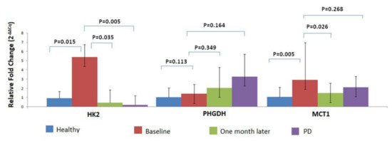 For a subgroup of these patients, peripheral blood samples were available both at baseline and one month later (n = 39) and at the time of relapse (n = 10). One month after surgery, the expression levels of HK2 and MCT1 genes were reduced compared to baseline expression levels. Overexpression was detected for HK2 in 1/39 CTC samples (2.6%), for PHGDH in 4/39 (10.3%) CTC samples and for MCT1 in 7/39 (17.9%) CTC samples. It is important to mention that the expression levels between these two timepoints differed significantly for HK2 and MCT1 (Figure 3).