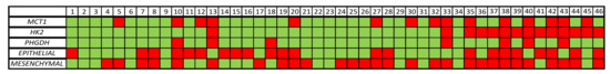 Heat map of epithelial markers (CK-8/CK-18/CK-19), EMT markers (VIM/TWIST-1) and MRGs (HK2/PHGDH/MCT1) as quantified by RT-qPCR. The red color represents overexpression, while the green color represents under expression or a lack of expression. The heatmap shows samples grouped by batch based on their positivity for MRGs.