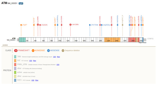 - Cavaciuti, E.; Lauge, A.; Janin, N.; Ossian, K.; Hall, J.; Stoppa-Lyonnet, D.; Andrieu, N. Cancer risk according to type and location of ATM mutation in ataxia-telangiectasia families. Genes Chromosomes Cancer 2005, 42, 1–9. [Google Scholar] [CrossRef] [PubMed]