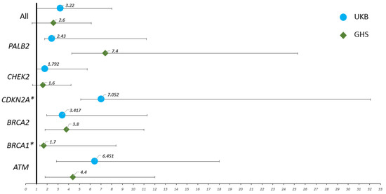 Next, we estimated the RR of PDAC in individuals harboring GPV for each of the six genes in the two cohorts (Table 4 and Figure 3). The highest RR was observed for CDKN2A (RR = 7, 95% CI 1.9–25), followed by ATM (RR = 6.4, 95% CI 3.6–11.6), and BRCA2 (RR = 3.4, 95% CI 1.4–7.9) in UKB and PALB2 (RR = 7.4, 95% CI 3.1–17.9), followed by ATM (RR = 4.4, 95% CI 2.6–7.6), BRCA2 (RR = 3.8, 95% CI 2.0–7.2), and CHEK2 (RR = 1.6, 95% CI 1.0–2.6) in GHS. These RRs were significantly increased (p < 0.05) for ATM and BRCA2 in both UKB and GHS, whereas CDKN2A, CHEK2, and PALB2 were each significant in only a single cohort.