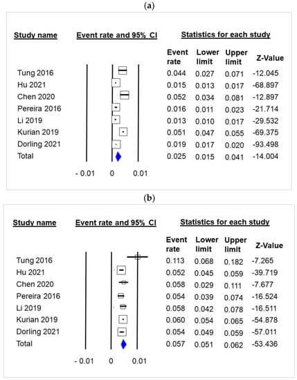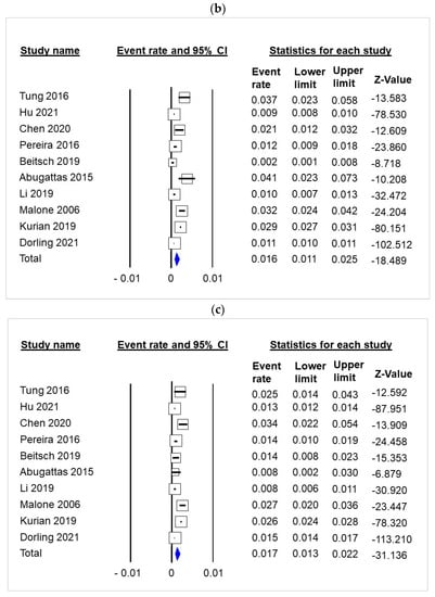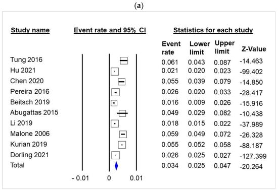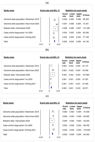 The frequency of gBRCA1 and gBRCA2 was 0.18% (95% CI 0.12–0.25) and 0.32% (95% CI 0.27–0.38), respectively (Figure 3b,c, Supplementary Materials, S3, S4). There was no evidence of publication bias in the funnel plot (Supplementary Materials, Meta-Analysis S9 and S10, respectively) or by Egger’s test.