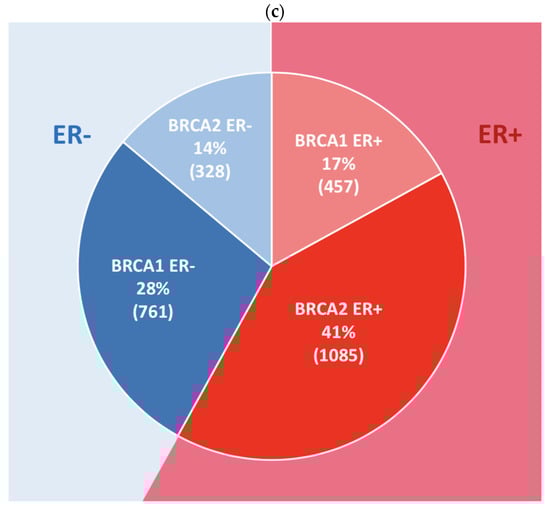 Among gBRCA1 carriers, 38% (457/1218) had ER+ tumors, whereas among gBRCA2 carriers, 75% (1085/1453) had ER+ tumors (Supplementary Materials, Table S2). Overall, 58% (1542/2671 of breast tumors with gBRCA carriage were ER+ (Supplementary Materials, Table S2) and 42% were ER-(1129/2671). Figure 2c represents the frequency of ER+ and ER- according to gBRCA1 or gBRCA2 carriage among unselected breast cancer patients. gBRCA1-ER+, gBRCA2-ER+, gBRCA1-ER-, gBRCA2-ER- status accounted for 17%, 41%, 28% and 14% of gBRCA breast cancers, respectively (Supplementary Materials, Table S2).