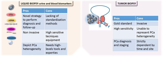 The limitation met in the recovery of tissue biopsy highlighted the necessity to implement alternative biological sources [42,43]. The introduction in routine diagnostic practice of highly sensitive techniques encouraged the comprehension of tumor landscape, analyzing circulating tumor nucleic acids (ctNA), circulating tumor cells (CTCs) and tumor-derived extracellular vesicles (EVs) released by cancer cells by using blood samples [43,44,45,46]. A comprehensive table summarizes the blood, serum and urinary biomarkers reported in this review (Table 1).