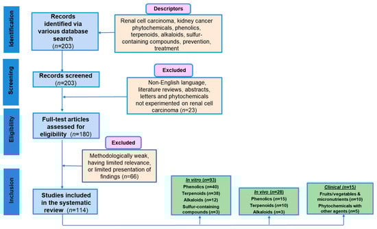 This study followed the recommended systematic review protocol, Preferred Reporting Items for Systematic Reviews and Meta-Analyses (PRISMA) criteria [37], for study selection as presented in Figure 1. This review has not been registered in the International Prospective Register of Systematic Reviews. Articles were collected using databases, primarily PubMed. No year constraints were placed on research articles. Keywords used during the search were phytochemicals, renal, kidney, cancer, phenolics, terpenoids, alkaloids, sulfur compounds, prevention, treatment, in vitro, in vivo, and clinical studies. Abstracts were reviewed to determine relevance and application to the study. Next, full-length articles were collected and evaluated for inclusion in or exclusion from the study. Only studies published in English were included, and abstracts and book chapters were excluded. Clinical studies were searched using clinicaltrials.gov. The literature search was independently conducted by six researchers (EMB., DAC., KNP, FBA, DMG, and CGW) and final reviews were conducted by a senior researcher (AB).