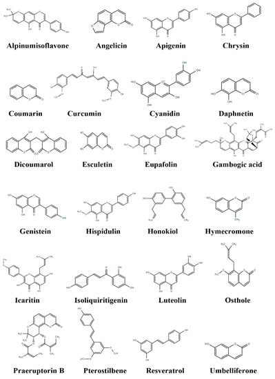 Daphnetin (Figure 2) is a coumarin derivative extracted from the Daphne Korean Nakai (Changbai daphne) plant, and Euphorbia semen, the dried and ripe seed of Euphorbia lathyris L. It has previously exhibited anti-inflammatory and anticancer properties [150]. Finn et al. [49] explored daphnetin’s anticancer effects using RCC cell line A-498. Daphnetin exhibited antiproliferative properties and inhibited cell cycle progression, specifically at the S phase. After treatment with daphnetin, p38 was shown to be activated, and expressions of cytokeratin 8 and cytokeratin 18 were increased. Higher concentrations of daphnetin were required to inhibit extracellular signal-regulated kinase 1 (ERK1) and ERK2.