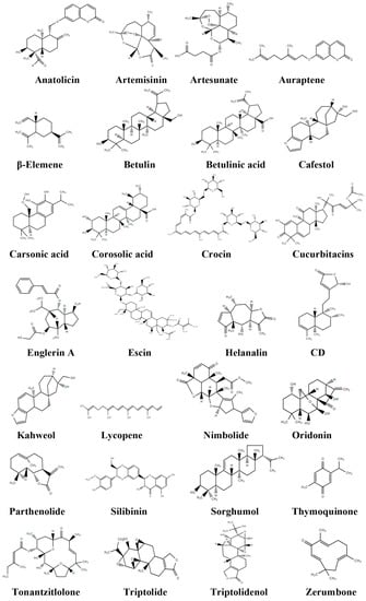 Chemical structures of terpenoids that exhibited anticancer effects in RCC. Chemical structures were created and converted using ChemSpider.com (accessed on 14 May 2022).