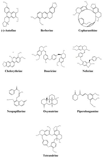 - Bailly, C. Cepharanthine: An update of its mode of action, pharmacological properties and medical applications. Phytomedicine 2019, 62, 152956. [Google Scholar] [CrossRef] [PubMed]