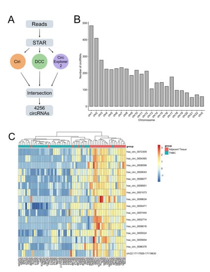 Characterization of circular RNAs (circRNAs) expressed in triple-negative breast cancer (TNBC). (A) Schematic overview of circRNA identification protocol, when we only considered circRNAs identified by all three software; (B) genomic origin of all identified circRNAs; (C) heatmap showing all 16 downregulated circRNAs in TNBC.