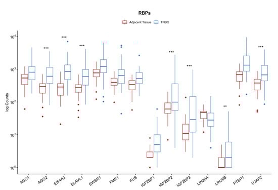Since the dataset used to map RBPs to circRNAs is composed of a large collection of different tissue samples, we evaluated whether the identified RBPs were expressed in our samples and found that all 14 proteins are present in TNBC (Figure 2). From all the RBPs investigated, seven were differentially expressed and upregulated (AGO2, EIF4A3, ELAVL1, IGF2BP2/3, LIN28B, and U2AF2), showing that these genes have an important role in triple-negative breast cancer development.