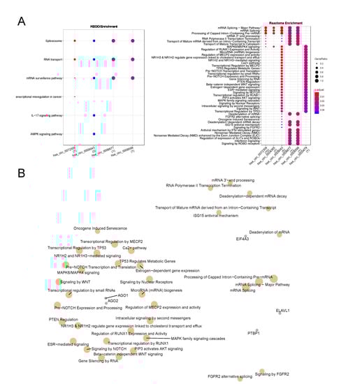 Next, we performed an enrichment analysis of the mapped RBPs in each circRNA considering both KEGG and Reactome pathways (Figure 3A). We observed that the RBPs that interact with hsa_circ_0004365 and circ_0000479 did not enrich to any KEGG pathway but the others bound to the remaining circRNAs enriched to pathways related to splicing events, RNA transport, and mRNA surveillance. This result indicates that these circRNAs act in important pathways related to gene regulation at the transcriptional level. Additionally, we observed that the RBPs bound to hsa_circ_0009043 also enriched to IL-17 and AMPK signaling pathways, which are important regulators of cell growth, autophagy, cell polarity, and chronic inflammation. Hsa_circ_0072309 was the only one that had its mapped RBPs enriched to pathways related to transcriptional misregulation in cancer, suggesting that this circRNA may be a key element in breast carcinogenesis.