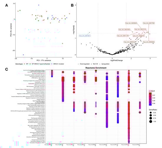 CircRNA transcriptomic profile according to mutational data of TNBC patients. (A) Principal component analysis showing overall similarity in expression data between Wildtype, Wildtype with BRCA1 hypermethylated, and BRCA1 mutated patients; (B) differential expression analysis showed significant results when comparing Wildtype and BRCA1 mutated patients, in which it was possible to observe nine differentially expressed circRNAs, being one downregulated (hsa_circ_0001821) and eight upregulated (hsa_circ_0001550, circ_0001178, circ_0006376, circ_0023942, circ_0001314, circ_0001789, and circ_0000343); (C) Reactome enrichment of the RBPs predicted to interact with these circRNAs revealed similar pathways to the ones enriched in the TNBC vs. adjacent tissue comparison.