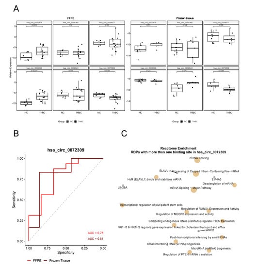 Hsa_circ_0072309 shows a promising potential as a biomarker of TNBC. (A) Validation of of hsa_circ_0072309, circ_0004365, circ_0006677, circ_0008599, circ_0009043, and circ_0000479 in two new sample sets: FFPE and frozen tissue (left and right panels, respectively) of TNBC patients (n = 6 and n = 10, respectively) and patients without cancer (n = 17 and n = 7, respectively. NC = non-cancer). p-values shown are from a Student’s t-test. Expression levels were calculated using the Comparative Ct method and ACTB and PUM1 were used as reference genes for frozen and ffpe tissues, respectively; (B) ROC curves of hsa_circ_0072309 in FFPE (bright red) and frozen tissue (dark red) samples showing an Area Under the Curve (AUC) with at least 0.78, indicating that this circRNA has good ability in discriminating TNBC from non-cancer patients; (C) Reactome enrichment of the RBPs with more than one binding site in hsa_circ_0072309 showing that this circRNA is acting in many cancer-related pathways, such as “Regulation of PTEN translation” and “Regulation of RUNX1 Expression and activity”.