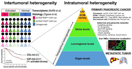 During pancreatic carcinogenesis, tumor cells interact with fibroblasts to shape a unique stroma favor, supporting tumor growth, invasion, and immunosuppression [53,113,114,115,116,117,118,119,120]. Research is underway to understand the complicated signaling networks between tumor cells, fibroblast subtypes, and immune cells to develop stroma-modifying therapies against PDACs [121,122,123,124,125]. Moreover, spatial analyses have revealed significant differences in the tumor−immune microenvironment using different intratumoral locations and organ sites [126,127]. This section discusses the geographical/spatial heterogeneity of PDAC stroma at niche, locoregional, and organ levels.