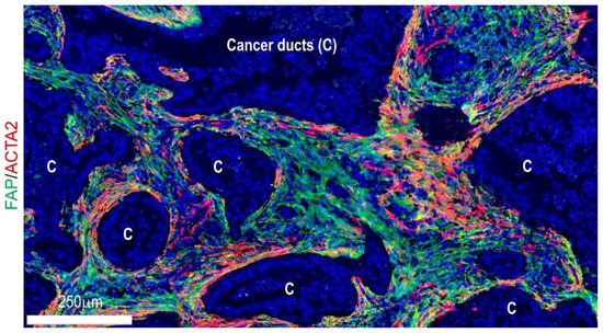 Visualization of fibroblast subpopulations in human pancreatic cancer tissues using fluorescent immunohistochemistry for ACTA2 and FAP.