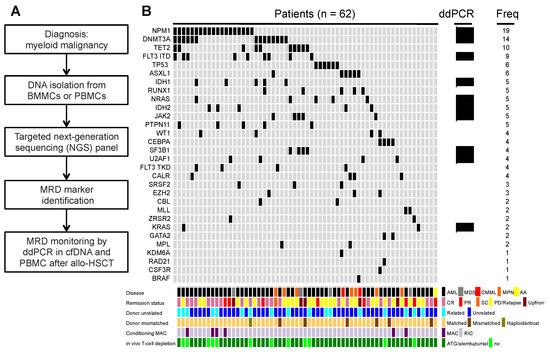 Identification of mutations for MRD monitoring in patients after allo-HSCT. (A) Workflow for identification of mutations for MRD monitoring in cfDNA in BMMCs from bone marrow aspirates or in PBMCs from peripheral blood. (B) Upper grid panel showing the identified mutations in single patients for MRD monitoring using droplet-digital PCR (ddPCR). Lower grid panel, disease and transplantation characteristics for each individual patient. ddPCR, droplet-digital PCR; cfDNA, circulating-free DNA; MRD, measurable residual disease; allo-HSCT, allogeneic hematopoietic stem cell transplantation; BMMCs, bone marrow mononuclear cells; PBMCs, peripheral blood mononuclear cells; NGS, next-generation sequencing; AML, acute myeloid leukemia; MDS, myelodysplastic syndrome; CMML, chronic myelomonocytic leukemia; MPN, myeloproliferative neoplasia; AA, aplastic anemia; CR, complete remission; PR, partial remission; SD, stable disease; PD, progressive disease; MAC, myeloablative conditioning; RIC, reduced intensity conditioning; ATG, anti-thymocyte globulin; Freq, frequency.