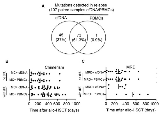 Kinetics of mixed chimerism and measurable residual disease in cfDNA and in PBMCs after allo-HSCT. (A) Comparison of mutations detected in paired PBMC and cfDNA samples (n = 119) included in this study. Most of the mutations were detected in both, PBMCs and cfDNA (n = 73, 61.3%) and a part of the mutations only in cfDNA but not in PBMCs (n = 45, 37%). (B,C) Graphs represent the time to first detection of MC and MRD after allo-HSCT in patients, respectively. Groups of patients were divided, if MC or MRD was detected simultaneously in paired samples (no diff.) or consecutively (with diff.). One patient died because of pneumonia (non-relapse mortality) with MRD detected in cfDNA but not in PBMCs. cfDNA, circulating-free DNA; PBMCs, peripheral blood mononuclear cells; allo-HSCT, allogeneic hematopoietic stem cell transplantation; MRD, measurable residual disease; MC, mixed chimerism; no diff, no difference; with diff., with difference.
