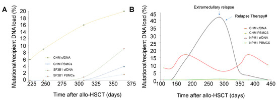 In twenty-six patients after allo-HSCT, recipient-derived cfDNA above the established chimerism discriminating threshold (18%) was detected before MC could be found in PBMCs. In this last group of patients, the mean detection time of MC for the first time after allo-HSCT was 328 days in cfDNA (range: 26–645 days) and 404 days in PBMCs (range: 48–1098 days). However, this time difference did not reach statistical significance (p = 0.31). In the remaining patients (n = 15), MC was detected for the first time at the same time point in cfDNA and PBMCs. The mean time for MC detection in this last group was 230 days (range: 27–652 days) (Figure 3B). MC levels in cfDNA from patients in complete remission and without evidence of complications after allo-HSCT remained stable, with moderate intra-individual fluctuations under the established threshold.
