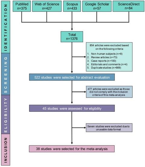 We initially found 1376 articles from five bibliographic databases based on the search strategy. Eight hundred fifty-four articles were excluded in the identification phase (duplicate studies, n = 669; case reports, n = 100; review articles, n = 73; non-human studies, n = 8; editorial and comment, n = 4), and the remaining 522 articles were further examined. A total of 477 articles were excluded as those did not comply with the study objective, and seven were further excluded due to unusable data format. As a result, 38 articles were finally included in this systematic review and meta-analysis, and full texts of all 38 articles were obtained (Figure 1).
