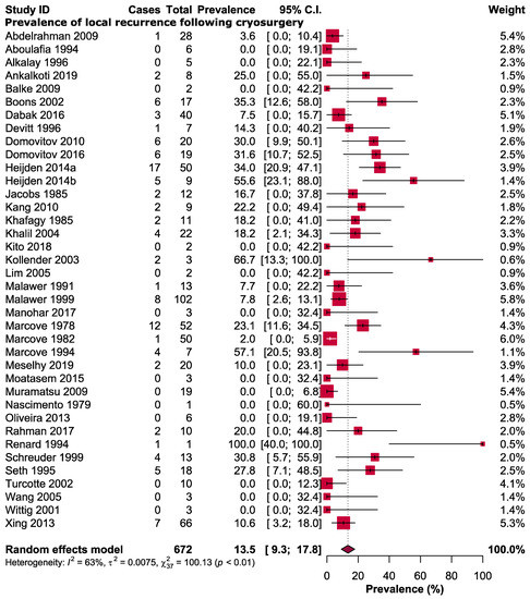 Two authors (S.N.S. and M.A.I.) extracted the following data and information from each eligible article into a prepared Excel spreadsheet separately: first author’s last name; study duration; location of the participants; mean age; the total number of giant cell tumours; mean follow up time and Campanacci grading. The random-effects model was used to analyse the pooled prevalence and 95% confidence intervals (CIs) of local recurrence in patients with giant cell tumours following cryosurgery.