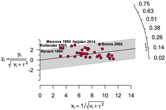 Based on the Galbraith plot, five studies [26,36,42,48,52] were identified as an outlier and thus possible sources of heterogeneity (Figure 5). Although low to moderate levels of heterogeneity were observed in the primary and subgroup analyses estimating the prevalence (between 2% and 73%), low levels of heterogeneity were detected, estimating the risk of local recurrence in the cryosurgery group versus other treatment types (0–21%). From the sensitivity analyses, we detected that after excluding outlier studies (2.9% lower), small studies (0.2% lower), and low-quality studies (0.2% higher), the result of the main finding did not alter substantially (Figure S3) indicating the reliability and robustness of our estimated prevalence of local recurrence of giant cell tumour of bone following cryosurgery.