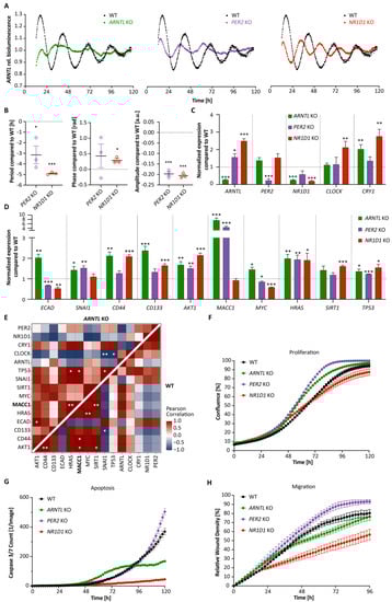 ARNTL promoter activity shows different oscillation patterns in HCT116 knockout cell lines. (A) Bioluminescence readouts for the promoter activity of ARNTL over the course of 120 h in HCT116 WT and CC knockout (ARNTL KO, PER2 KO and NR1D1 KO) cell lines. (B) Period, phase and amplitude analysis of bioluminescence data of HCT116 knockout cells using Chronostar (n = 3, mean ± SEM). TWT = 26.1 ± 0.1 h, TARNTL KO = ND, TPER2 KO = 23.0 ± 0.8 h, TNR1D1 KO = 21.2 ± 0.1 h. (C) Gene expression analysis of CC genes PER2, CRY1, NR1D1, CLOCK, and ARNTL in HCT116 WT and knockout cell lines at 24 h after synchronization (n = 3, mean ± SEM). (D) Gene expression analysis of related genes in EMT, cell cycle, death and metastasis in HCT116 CC knockout cell lines at 24 h after synchronization (n = 3, mean ± SEM). (E) Heatmaps of Pearson correlation between each pair of CC and EMT-related genes for HCT116 WT versus ARNTL KO. (F–H): Proliferation (F), Apoptosis (G) and Migration (H) analysis of HCT116 WT and CC knockouts using live-cell imaging over several days (n > 8, mean ± SEM, significance tested by comparing AUC to WT, two-tailed unpaired t-test). ND: not defined. * p < 0.05, ** p < 0.01, *** p < 0.001, two-tailed unpaired t-test.