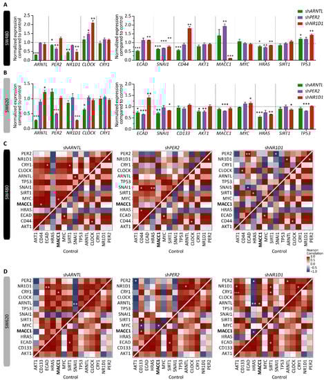 Core-clock manipulation affects EMT gene expression in SW480 and SW620 cells. Gene expression analysis of core-clock genes PER2, CRY1, NR1D1, CLOCK, and ARNTL as well as EMT-related genes in control and core-clock knockdown (shARNTL, shPER2 and shNR1D1, respectively) cell lines in SW480 (A) and SW620 (B) cells at 24 h after synchronization (n = 3, mean ± SEM). Heatmaps of Pearson correlations between each pair of core-clock and EMT-related genes for (C) SW480 and (D) SW620 shARNTL, shPER2 and shNR1D1 cells compared with the control cell line. * p < 0.05, ** p < 0.01, *** p < 0.001; two-tailed unpaired t-test.