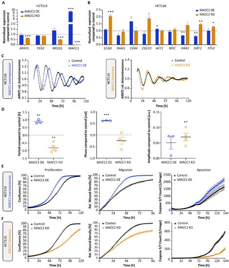 Interestingly, MACC1 perturbations led to significant changes in the period, phase and amplitude of clock oscillation, as reported here for the first time (Figure 3C,D). While MACC1 OE significantly increased the period of ARNTL-promoter activity in HCT116 (Figure 3D, ∆TMACC1 OE = 0.9 ± 0.1 h, mean ± SEM, p < 0.01, n = 3) and SW480 cells (Figure 4E, ∆TMACC1 OE = 0.8 ± 0.3 h, mean ± SEM, p < 0.05, n = 3), MACC1 KO significantly decreased the period (Figure 3D, ∆TMACC1 KO = −0.8 ± 0.2 h, mean ± SEM, p < 0.01, n = 4). We did not detect reliable circadian oscillations in the SW620 cells, which was in line with previous reports for this cell line (Figure 4D) []. This opposing effect in the period of oscillations between MACC1 OE and KO in HCT116 was also evident in the cell proliferation, migration and apoptosis data, with increased proliferation, migration and apoptosis upon overexpression of MACC1 and an opposite effect upon MACC1 KO (Figure 3E,F, p < 0.001, AUC compared with the respective control cell line). Altogether, these data point to a potential interaction between MACC1 and the circadian clock network, which contributes to altered clock phenotype and cancer progression, possibly via core-clock components.