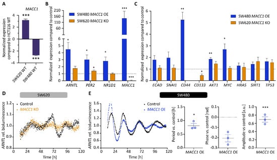 MACC1 manipulation in SW480 and SW620 cell lines leads to differential expression in clock and EMT-related genes (A) Analysis of MACC1 expression between HCT116 WT, SW480 WT and SW620 WT (n = 3, mean ± SEM). Gene expression analysis of core-clock genes ARNTL, PER2 and NR1D1 (B) as well as related genes in EMT, cell cycle, death and metastasis (C) in SW480 MACC1 overexpressing (OE) and SW620 MACC1 knockout (KO) cells, respectively. Samples were collected at 24 h after synchronization. Each condition was compared with its respective control cell line. (n = 3, mean ± SEM). (D,E) ARNTL-promoter activity in SW620 MACC1 knockout (D) and SW480 MACC1 overexpressing (E) cell lines compared with the respective control condition. Tcontrol = 24.2 ± 0.3 h and TMACC1 OE = 25.0 ± 0.1 h, mean ± SEM. Measurements were made over five days using live-cell bioluminescence readouts. Period, phase and amplitude were measured using Chronostar. (n = 3, mean ± SEM). * p < 0.05, ** p < 0.01, *** p < 0.001; two-tailed unpaired t-test.