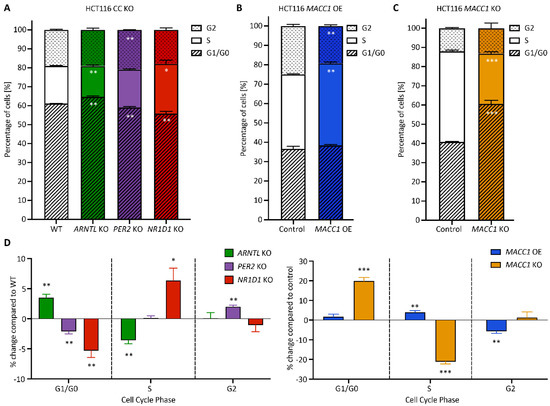 CC KO and MACC1 manipulation alter cell cycle dynamics in HCT116. Cell cycle phase distribution in CC KO HCT116 cells (A) as well as (B) MACC1 overexpressing and (C) MACC1 KO HCT116 cells. (D) Normalized cell cycle phase distribution in CC KO and MACC1 manipulated HCT116 cells compared with WT or control, respectively (n = 3, mean ± SEM, * p < 0.05, ** p < 0.01, *** p < 0.001; two-tailed unpaired t-test). Cells were synchronized and collected 24 h after synchronization.