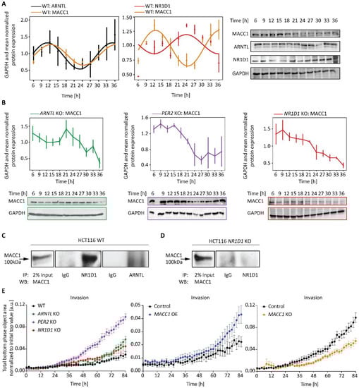 MACC1 protein oscillates similar to ARNTL and antiphase to NR1D1 in HCT116 cells. 30 h time-course protein expression via Western blotting in HCT116 WT (A) and core-clock KO cells (B). (A) ARNTL, NR1D1 and MACC1 expression in synchronized WT cells. (B) MACC1 expression in synchronized WT, ARNTL KO, PER2 KO and NR1D1 KO cells. GAPDH and mean normalized data is presented (n = 3, mean ± SEM). Rhythmicity analysis was performed using Cosinor in Discorhythm R package for a period of 24 h. A cosine curve was fitted for rhythmic data sets (p < 0.05), and data points were connected with closed lines for arrhythmic data points (p > 0.05). (C) Co-IP analysis of MACC1 binding to NR1D1 and not ARNTL in HCT116 WT and (D) NR1D1 KO lysates. IP was performed for NR1D1 or ARNTL. Western blot was performed using MACC1 antibody. IgG: Isotype control. (E) Chemotaxis cell invasion analysis of HCT116 CC KO as well as MACC1 OE and MACC1 KO cells using IncuCyte S3 live-cell analysis. Cell invasion was quantified by measuring total phase object area on the bottom layer of the inner chamber normalized to the initial phase object area of the top layer within 84 h. Data presented as mean ± SEM (n = 8). Significance tested by comparing AUC with WT or the respective control cell line; two-tailed unpaired t-test. The original western blots were shown in File S1.