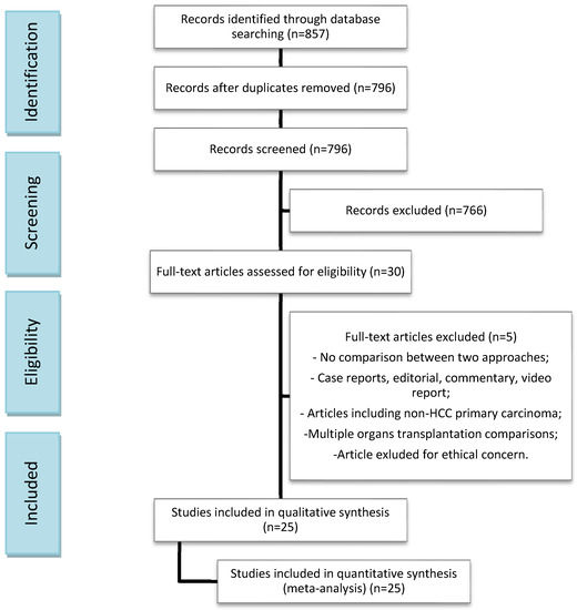 Our search strategy disclosed 857 publications concerning Salvage LT. Twenty-nine full papers were examined; however, five studies were not included in the analysis because they did not meet the inclusion criteria. Finally, 25 articles and a total of 11,275 patients were included in the meta-analysis; 9645 patients were offered a Primary LT for HCC, whereas 1630 underwent Salvage LT for HCC recurrence or impaired liver function after primary liver resection. No randomized trials have been published so far. The flow diagram in Figure 1 shows the search process. The baseline characteristics of the two groups are presented in Table 1 and Table 2. Technical and postoperative outcomes and oncological and survival features are tabulated in Table 3. The two groups were similar as regards etiology, HBV, and/or HCV infection rates and maximum tumor diameter pre-LT and on post-LT pathology. The number of patients in each study ranged from a minimum of 42 to up to 6975. The MINORS scale assessed a low-quality heterogeneity between studies, providing a mean score of 21.8 (SD: 0.85) and a median score of 22 (range 20–23) (Table 1).