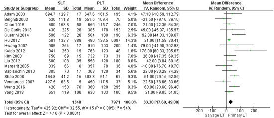 The mean operating time was 600.44 min in the SLT group and 547.12 min in the PLT group; sixteen articles reported this item. Operating time was shorter in the Primary LT group, and the meta-analysis showed a statistically significant difference (MD 33.30, (95% CI 17.60, 49.00) p < 0.0001), as shown in Figure 2.