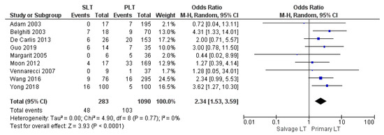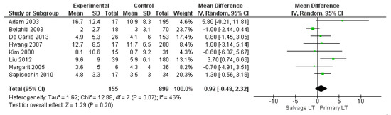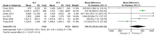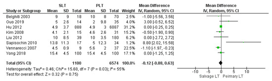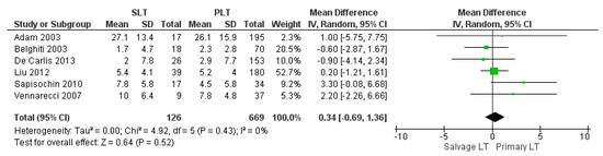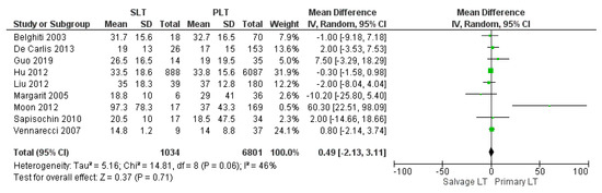 The mean hospital stay was 33.01 days in the SLT group and 26.44 in the PLT group; nine articles described this variable. The meta-analysis reported that the mean hospitalization was shorter in the PLT group than in the Salvage LT group, although this imbalance was not significant (MD 0.49, (95% CI −2.13, 3.11) p = 0.71), as shown in Figure 11.