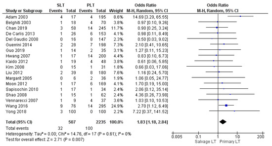 Perioperative mortality rate was 6.31% (32/507) in the SLT group and 4.47% (100/2235) in the PLT group; slightly higher in the former group. The meta-analysis of the 18 trials showed a statistically significant difference in the rate of perioperative mortality between the two groups (OR 1.83, (95% CI 1.18, 2.84) p = 0.007), as shown in Figure 7.