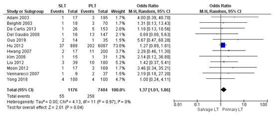 The rate of vascular complications was evaluated by 12 studies. The vascular complications rate was similar between SLT and PLT: 4.68% (55/1176) and 3.48% (258/7404), respectively. The meta-analysis revealed a statistically significant difference (OR 1.37, (95% CI 1.01, 1.86) p = 0.04), as shown in Figure 12.