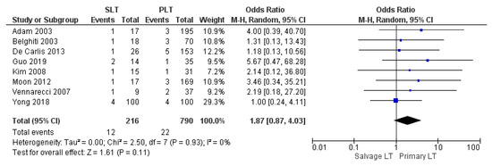 Seven studies reported the retransplantation rate. The retransplantation rate was 6.11% (8/131) in the Salvage LT group and 7.22% (70/969) in the PLT sample. However, the different rates were not statistically significant between the two treatment strategies (OR 1.07, (95% CI 0.51, 2.24) p = 0.86), as shown in Figure 8.