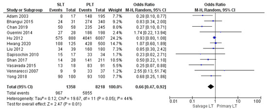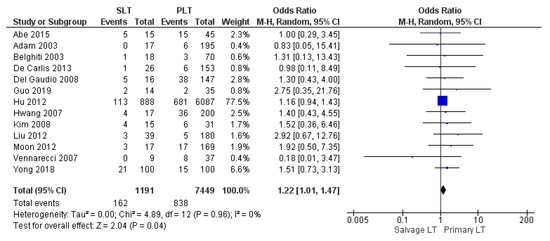 Thirteen papers analyzed the frequency of biliary complications (stenosis, leakage, and fistula). The biliary complication rate was significantly higher in the SLT group than the PLT group: 13.6% (162/1191) and 11.2% (838/7449), (OR 1.22, (95% CI 1.01, 1.47) p = 0.04), as shown in Figure 14.