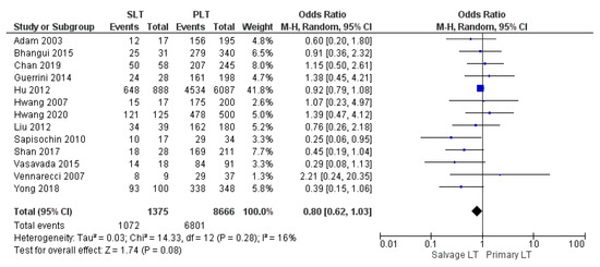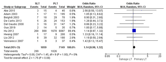 Ten studies retrospectively assessed overall infection and sepsis rate. Infection rate of the SLT group was slightly higher than the PLT group: 28.2% (299/1059) and 25.5% (1826/7149), respectively. Nevertheless, the meta-analysis stated that the result was not significant (OR 1.14, (95% CI 0.98, 1.32) p = 0.08), as shown in Figure 15.