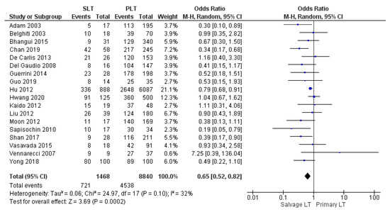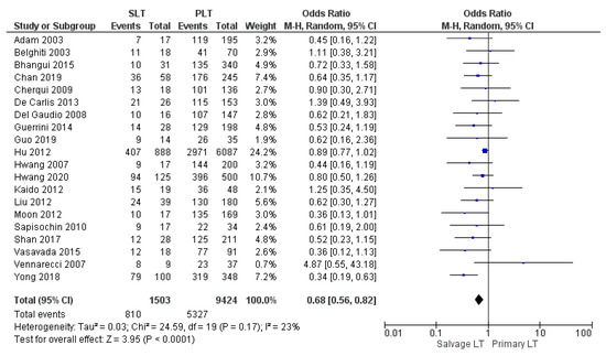 Hepatocellular carcinoma (HCC) is a major contributor to the world’s cancer burden and is currently the third leading cause of cancer-related death, with incidences increasing continuously in recent years [1]. Locoregional treatments (mainly radiofrequency ablation and transarterial chemoembolization), liver resection (LR), and liver transplantation (LT) are well-defined and widely accepted treatments for hepatocellular carcinoma [2,3,4]. However, the best therapy for HCC is still an open and controversial oncological challenge. LT is considered the gold standard therapy for early HCC within liver cirrhosis since it radically removes the cancer and any dysplastic foci and it treats liver disease-related complications (e.g., portal hypertension) [5,6,7]. The oncological benefits of LT for HCC in terms of 5-year overall survival (OS) and 5-year disease-free survival (DFS) are well-documented: 75% and 90%, respectively [8]. However, organ shortage and the risk of drop-out from the waiting list for tumor progression and deterioration of liver function represent the main limitations for LT [9]. Nowadays, liver surgery for HCC has been demonstrated to be feasible and safe with very low postoperative morbidity and almost zero perioperative mortality [10,11]. Studies on minimally invasive liver surgery have also strongly confirmed these findings [12]. Therefore, primary LR for early HCC with preserved liver function and mild portal hypertension is considered the first-choice treatment [13,14]. Nevertheless, most published data showed a 5-year survival rate and a 5-year DSF after LR for HCC due to cancer relapses of 60% and 30%, respectively [15]. Salvage Liver Transplantation (SLT) is an alternative and promising curative strategy for HCC recurrence or deterioration of liver function after primary liver resection [16]. Moreover, some authors recently described “de principe” Salvage LT (pre-emptive transplantation before tumor recurrence) for a subgroup of patients who present poor histological features and aggressive biological tumor behavior on the final pathology of the resected specimen [17]. Previous studies comparing SLT with primary liver transplantation (PLT) have reported conflicting results in terms of surgical complication and risk of HCC recurrence [18,19,20,21]. However, with the advancement of surgical techniques, recent papers have shown SLT to be an effective and feasible treatment for patients with HCC recurrence after primary liver resection with a good long-term survival rate [22]. The purpose of this meta-analysis is to investigate the technical, postoperative, oncological and survival outcomes of PLT compared with SLT.