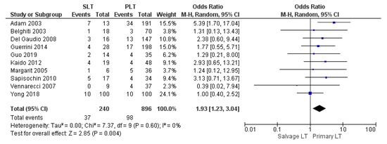 Ten studies reported the postoperative bleeding rate. The Salvage LT group’s postoperative bleeding rate was considerably higher than the Primary LT group: 8.25% (88/1066) and 5.73% (411/7165), respectively. The difference in bleeding rates was statistically significant (OR 2.19, (95% CI 1.25, 3.81) p = 0.006), as shown in Figure 9.