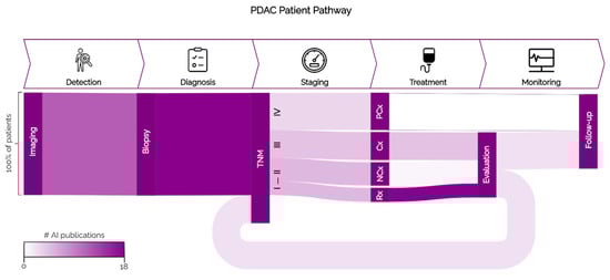 PDAC patient pathway. The steps of the general cancer patient pathway are shown in the top part of the figure. Below, the vertical boxes show the actions/guidelines for PDAC used in each step. The width of the streams represents the proportion of patients that go through each branch of the pathway, and the colours of the streams represent the number of AI publications found on that topic. Rx: resection; nCTx: neoadjuvant chemo(radio)therapy; aCTx: adjuvant/induction therapy; Px: palliative care.