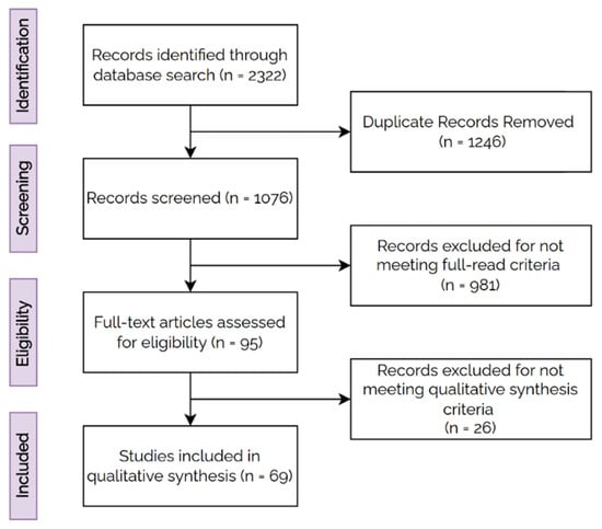A total of 2322 records were retrieved from the electronic databases, and 1076 articles remained after duplicate removal. Titles and abstracts were reviewed on the basis of the inclusion criteria, and 95 articles were eligible for full-text screening. Finally, a total of 69 studies fulfilled the inclusion criteria and were considered for analysis. The flowchart for the inclusion of studies is shown in Figure 2.