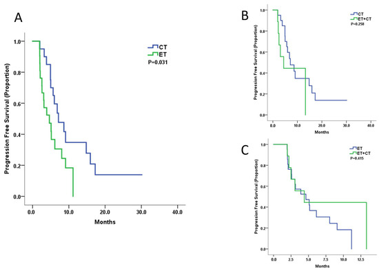 Kaplan–Meier curves for progression-free survival by treatment arm: (A). ET versus CT; (B) CT versus ET + CT; (C) ET versus ET + CT.