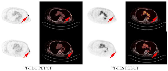 - Boers, J.; Loudini, N.; Brunsch, C.L.; Koza, S.A.; de Vries, E.F.; Glaudemans, A.W.; Hospers, G.A.; Schröder, C.P. Value of (18)F-FES PET in Solving Clinical Dilemmas in Breast Cancer Patients: A Retrospective Study. J. Nucl. Med. 2021, 62, 1214–1220. [Google Scholar] [CrossRef]