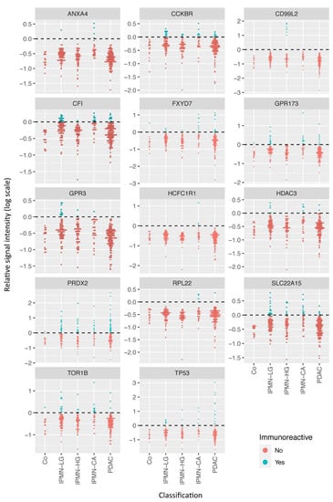 The proportion of immunoreactive patient samples for each disease category (Co, IPMN-LG, IPMN-HG, IPMN-CA, and PDAC) and for each of the selected proteins is shown in a heatmap (Figure 3).